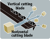 The raw materials are cut up and down by the horizontal plane of the cutter, then further cut left and right by fine cutters placed perpendicularly.